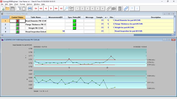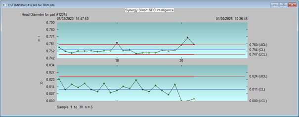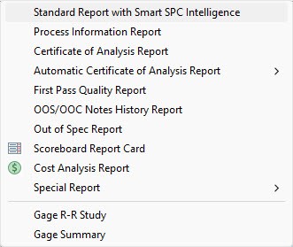 Créons un rapport standard simple utilisant l’option « Smart SPC Intelligence » dans lequel la carte X-barre et R ci-dessus est affichée.