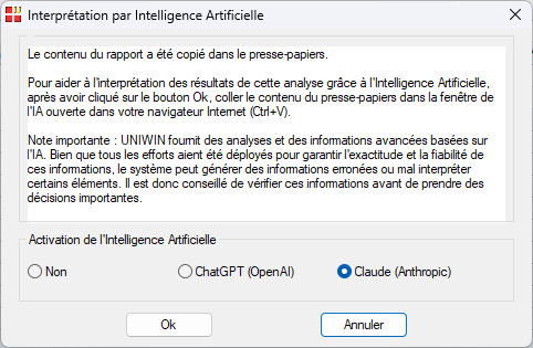 A partir de sa version 10.5.0, UNIWIN permet dans toutes ses analyses de générer un rapport directement copiable dans des outilis d’Intelligence Artificielle (IA) comme ChatGPT d’OpenAI et Claude d’Anthropic pour obtenir des interprétations automatiques et des conseils concernant les résultats de ces analyses.