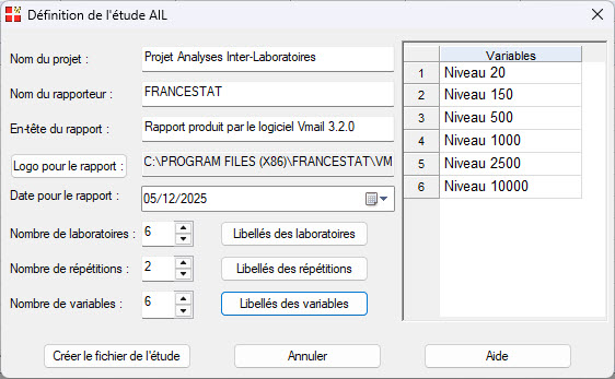 La première étape consiste à définir les caractéristiques de l’étude : nom du projet, nom du rapporteur, en-tête du rapport, nombres de laboratoires, de répétitions et de variables ainsi que les éventuels libellés associés. Notre étude comporte 6 laboratoires (jours), 2 répétitions et 6 niveaux.