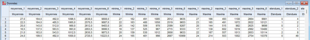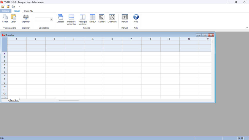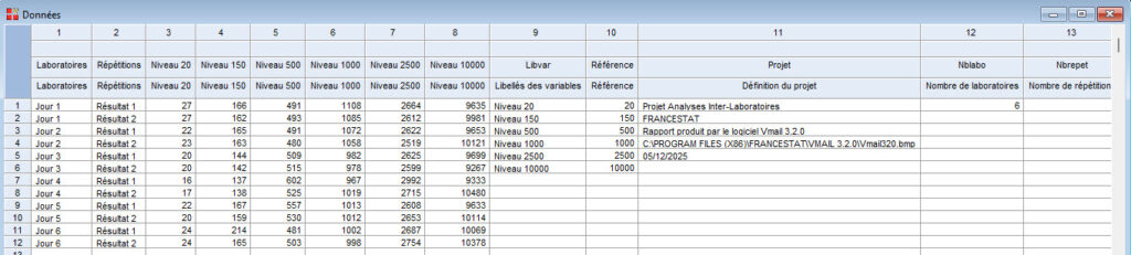 Les colonnes du tableur autres que celles des données contiennent les libellés des laboratoires, des répétitions, des variables ainsi que les autres caractéristiques du projet. Les données collectées peuvent alors être saisies dans le tableur du logiciel.