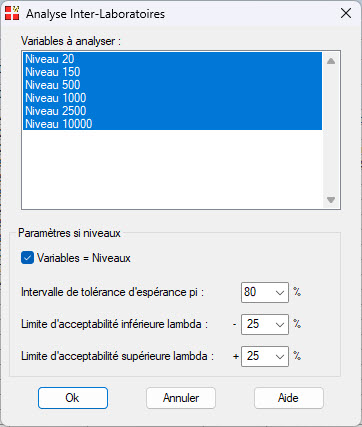 Cocher la case ‘Variables = Niveaux’ si les différentes variables sélectionnées représentent différents niveaux de concentration.  Dans ce cas les variables doivent être organisées et sélectionnées de façon à respecter la hiérarchie des niveaux (du plus bas au plus haut). Préciser également la probabilité pour l’intervalle de tolérance et les limites d’acceptabilité si le profil d’aptitude doit être calculé.