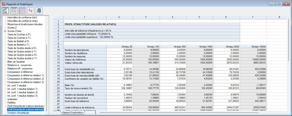 18. Bilan pour chaque variable (nombre de laboratoires ayant participés à l’analyse, moyenne globale pour l’ensemble des laboratoires ayant participés à l’analyse, minimum global pour l’ensemble des laboratoires ayant participés à l’analyse, maximum global pour l’ensemble des laboratoires ayant participés à l’analyse, l’écart-type global pour l’ensemble des laboratoires ayant participés à l’analyse, variance des moyennes, variance inter-laboratoires, variance de répétabilité, écart-type de répétabilité sr, répétabilité à 95% r (sous hypothèse de normalité), coefficient de variation de la répétabilité CVr (= 100 * sr / M), variance de reproductibilité, écart-type de reproductibilité sR, reproductibilité à 95% R (sous hypothèse de normalité), coefficient de variation de la reproductibilité CVR (= 100 * sR /M), coefficient de variation limite de la reproductibilité CVR limite (modèle d’Horwitz, 22-Log10(M)/2)