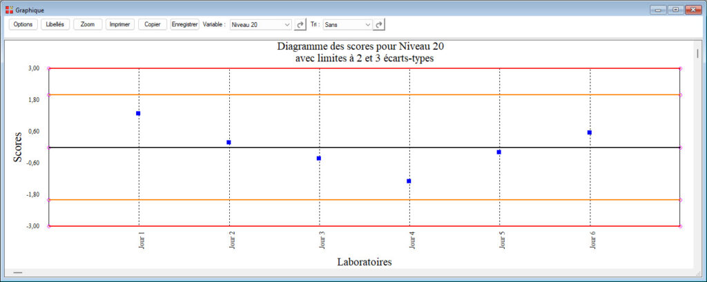 Le cinquième graphique affiche les scores des laboratoires avec des lignes horizontales tracées à +/- 2 ou +/3 écarts-types.