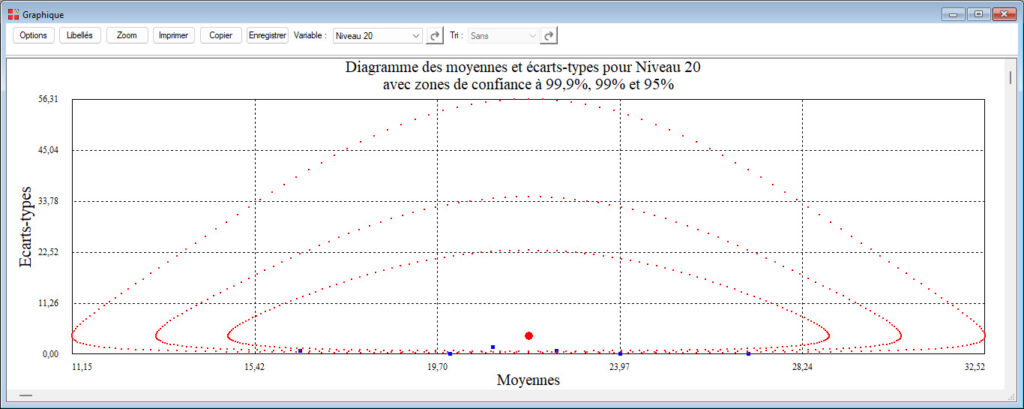 Le sixième graphique affiche les moyennes versus les écarts-types ainsi que les zones de confiance à 95%, 99% et 99,9%.