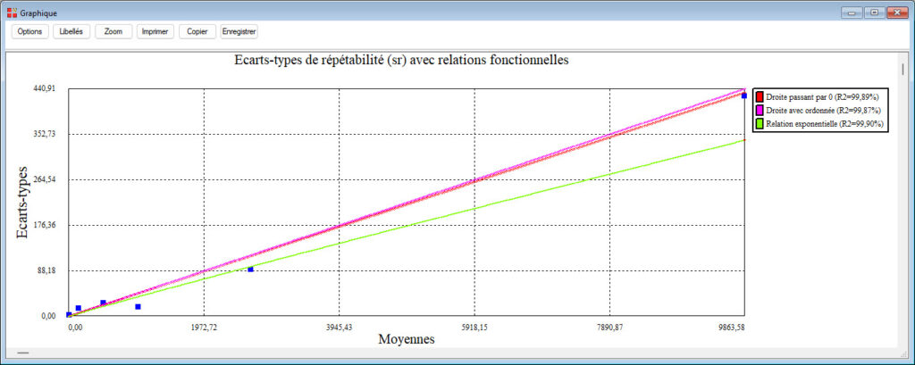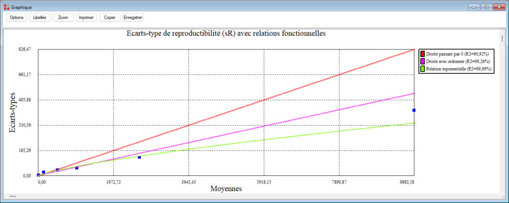 Le huitième graphique affiche la relation entre les moyennes et les écarts-types de réproductibilité sR. Si l’écart-type est proportionnel à la moyenne, alors les points doivent s’aligner sur la droite. On peut alors exprimer la fidélité par un coefficient de variation.