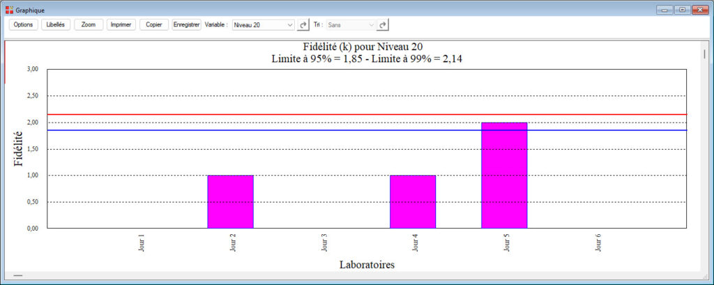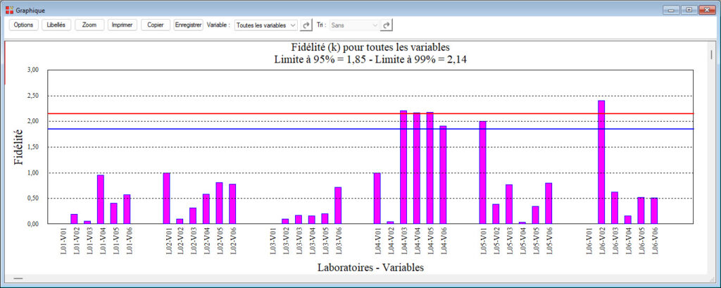 Ce graphique affiche la fidélité pour chaque laboratoire. Tout laboratoire au-delà des limites sera suspect.