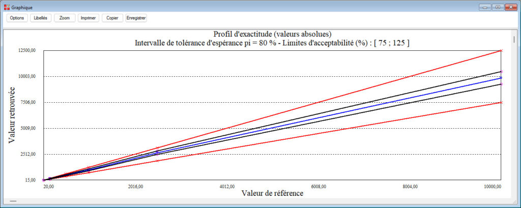 Le quatrième graphique affiche les résultats des mesures triés par ordre croissant et l’intervalle de confiance à 95% de la moyenne théorique. La ou les courbes représentent les fractiles attendus pour des lois normales ayant pour moyenne la moyenne générale ou la valeur de référence.